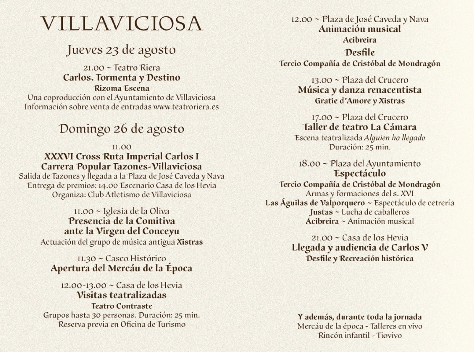 El tradicional puerto pesquero de Tazones fue escenario, en 1517, de la llegada del emperador CARLOS V para tomar posesión de la corona española. Hoy día este evento se conmemora cada año con una recreación histórica del desembarco, así como la organización de diferentes actividades en torno a la vida cotidiana de este pueblo marinero en el siglo XVI, que incluyen la confección y muestras de artes de pesca, el teñido de velas, el tejido de redes, la subasta de pescados o el asado de centollos y sardinas. Al día siguiente los actos continúan en la localidad de VILLAVICIOSA, con el paseo del monarca y su séquito por las calles del casco histórico de la capital